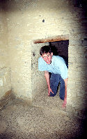 Individual passing through small doorway.